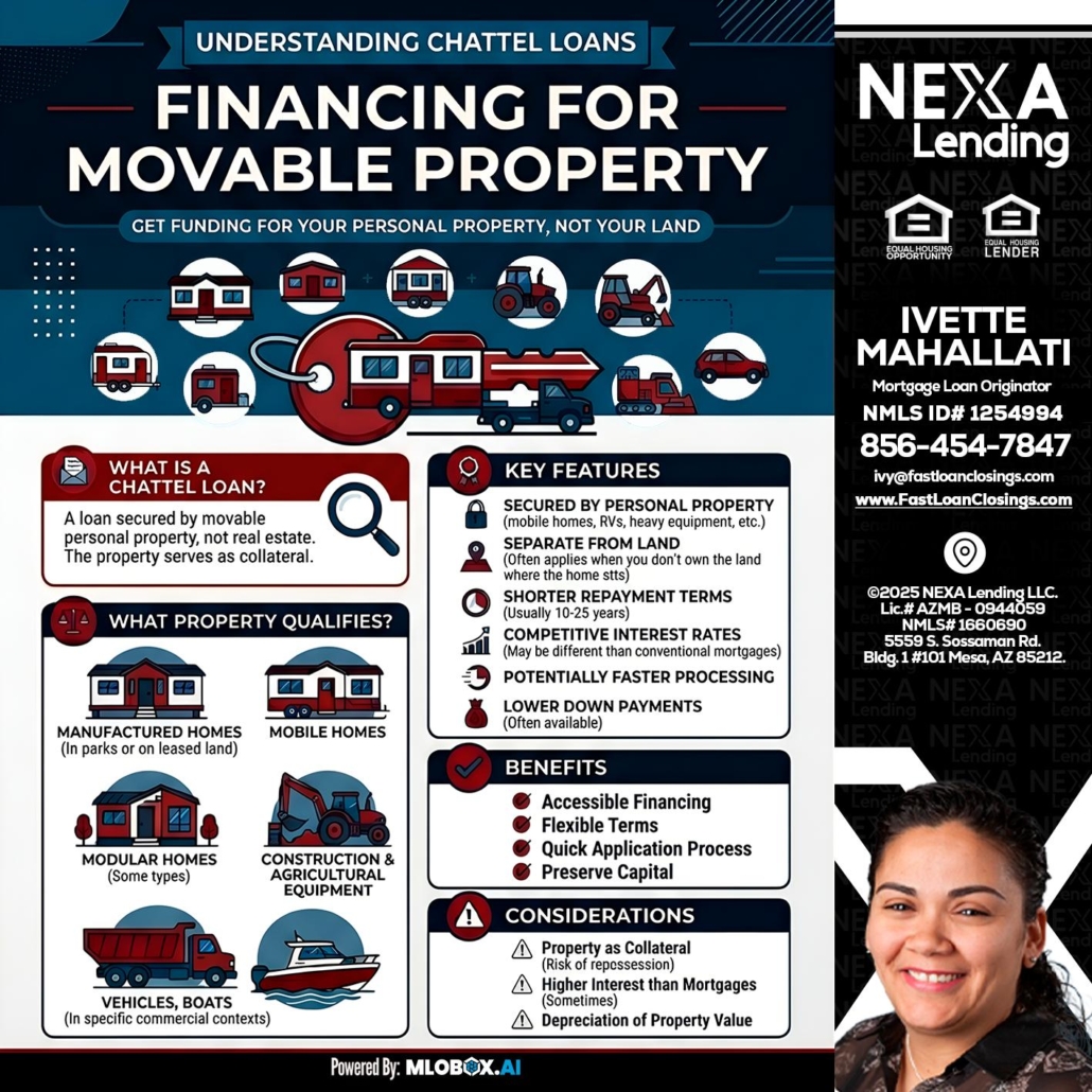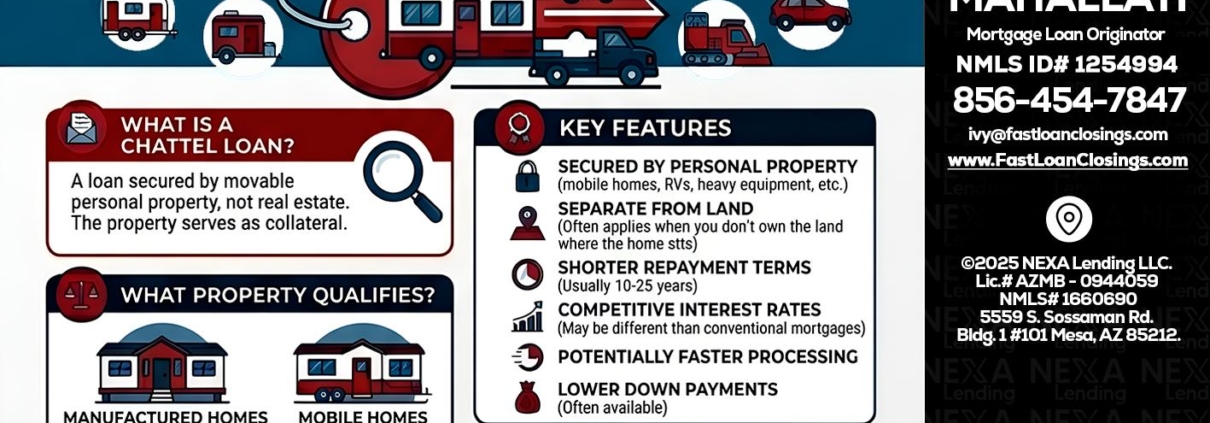 Hi, my name is Ivette Mahallati. I’m a Loan Officer offering personalized mortgage solutions, fast customized quotes, great rates and service with integrity. If you’re interested in learning more about the Chattel loan or any other, just let me know and I’ll walk you through your options.
