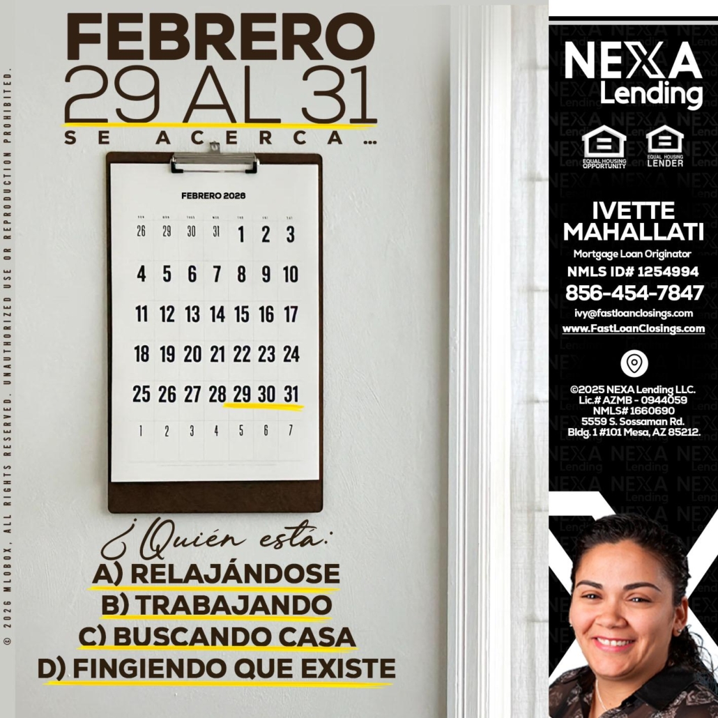 febrero 29 al 31 - Ivette Mahallati -Mortgage Loan OriginatorHi, my name is Ivette Mahallati. I’m a Loan Officer with NEXA Lending LLC., offering personalized mortgage solutions, fast customized quotes, great rates and service with integrity.