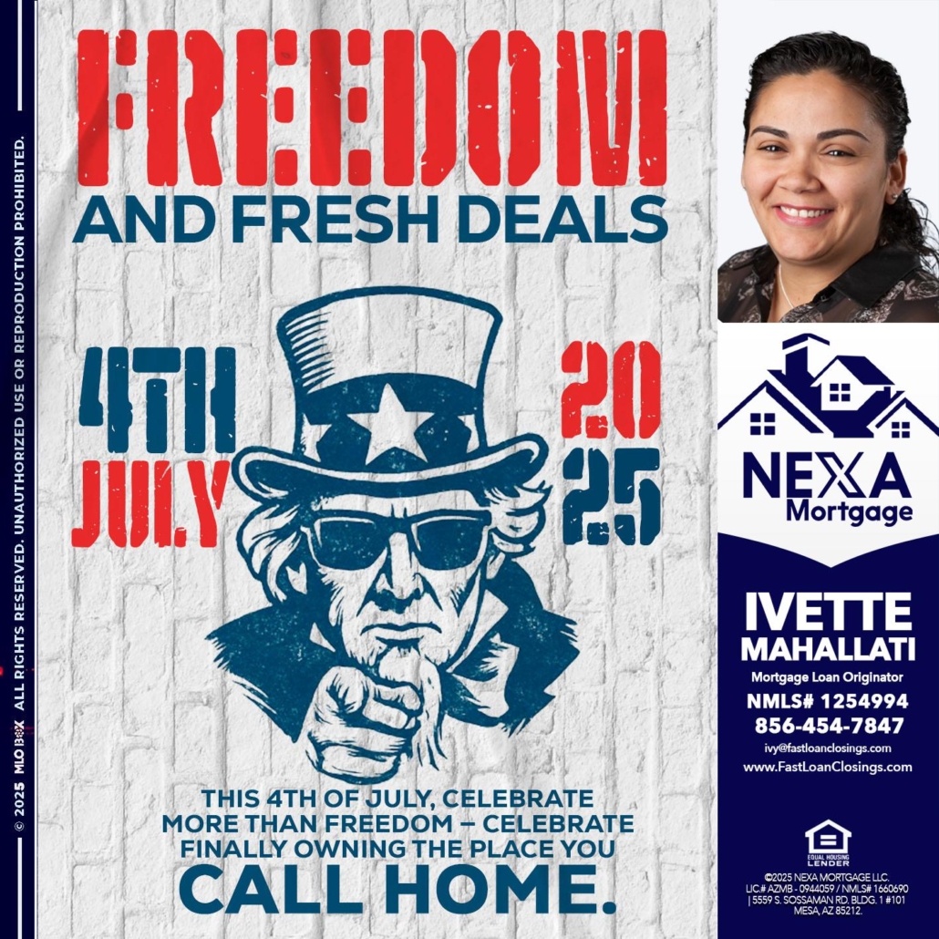 FREEDOM - Ivette Mahallati -Mortgage Loan OriginatorHi, my name is Ivette Mahallati. I’m a Loan Officer with NEXA Mortgage LLC., offering personalized mortgage solutions, fast customized quotes, great rates and service with integrity.