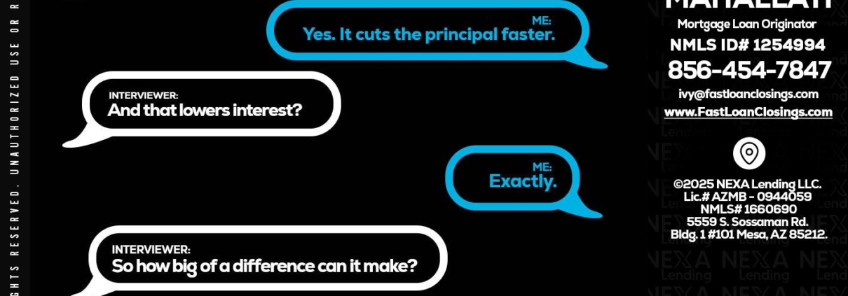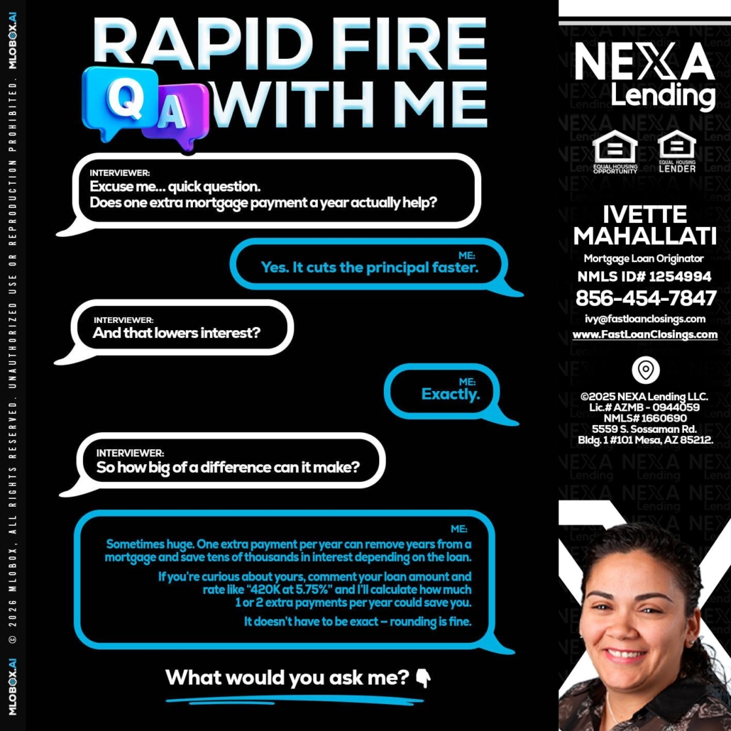 RAPID Q&A - Ivette Mahallati -Mortgage Loan OriginatorHi, my name is Ivette Mahallati. I’m a Loan Officer with NEXA Lending LLC., offering personalized mortgage solutions, fast customized quotes, great rates and service with integrity.