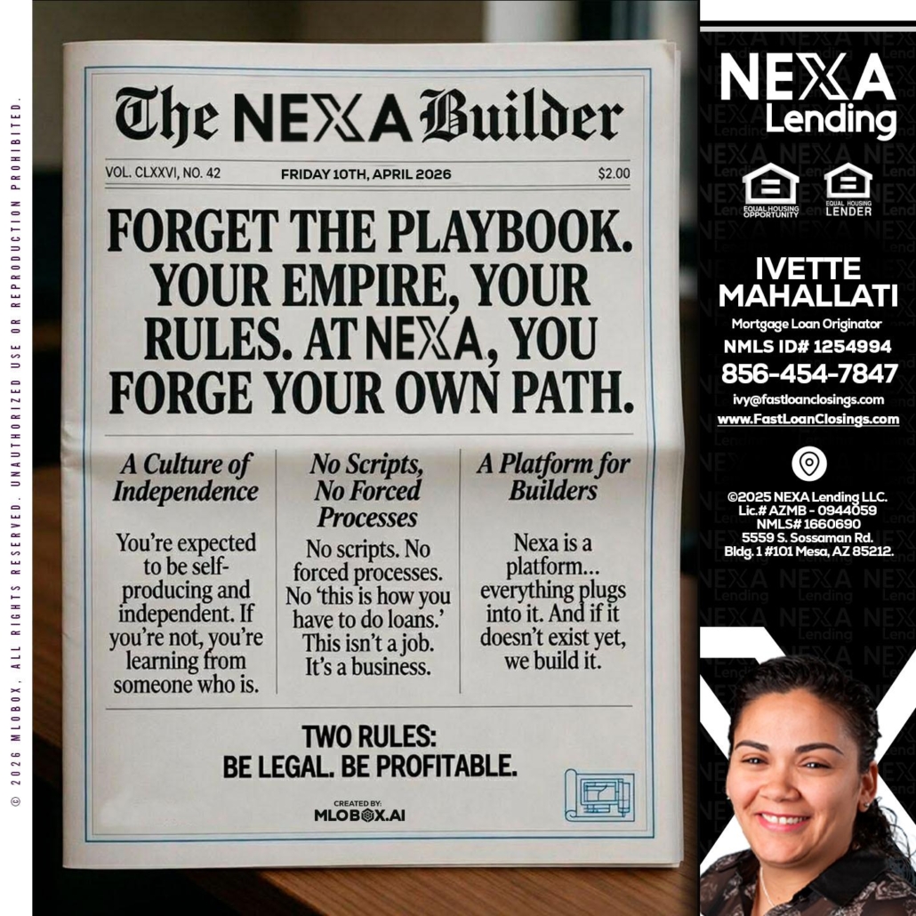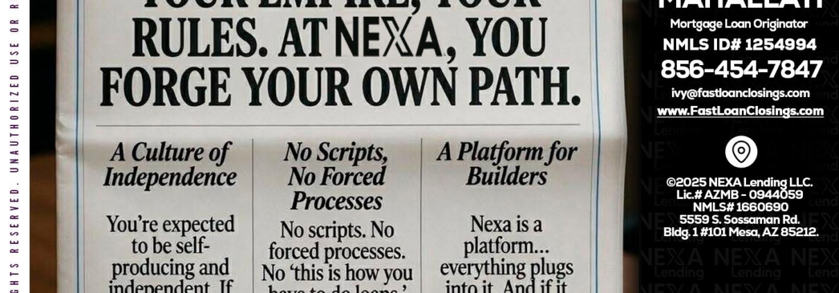 Hi, my name is Ivette Mahallati. I’m a Loan Officer with NEXA Lending LLC., offering personalized mortgage solutions, fast customized quotes, great rates and service with integrity.